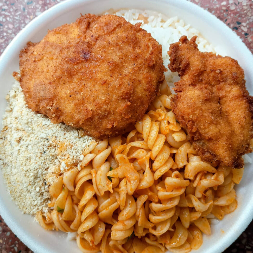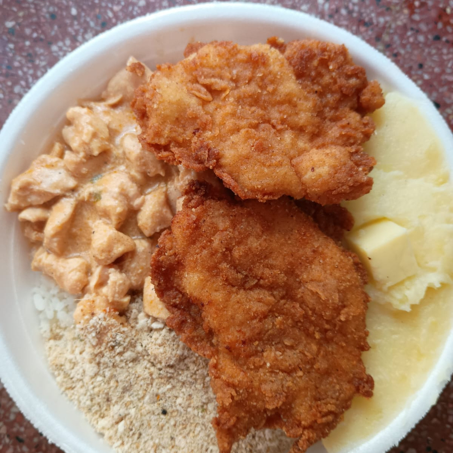 Marmita Média de Filé de frango a milanesa, É composta por: 150 gramas de feijão, 350 gramas de arroz, 90 gramas de guarnição (purê de batata com queijo ou macarronada, vc escolhe 1 opção), 1 potinho de salada, farofa e 100 gramas de filé de frango a milanesa. *Não é possível substituir nenhum item.*