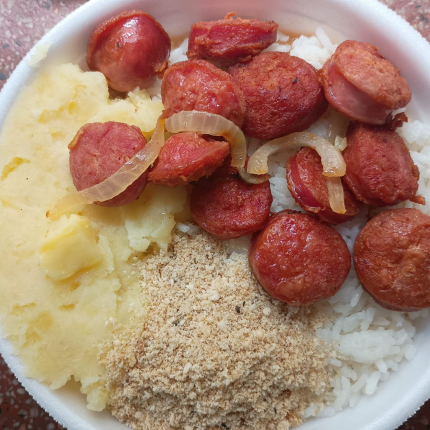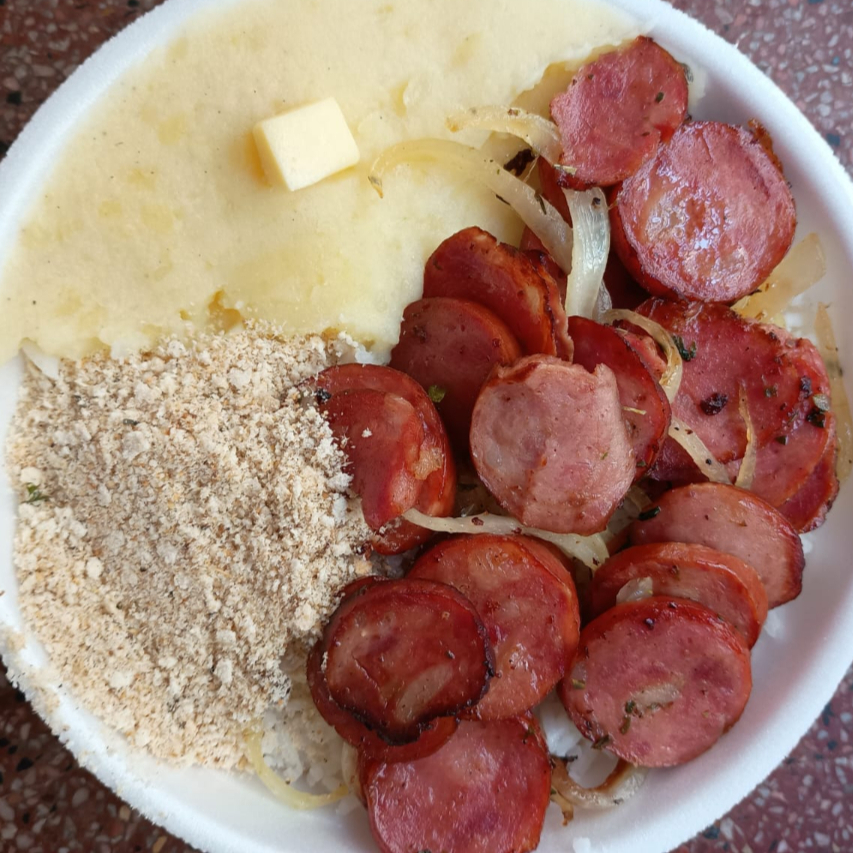 Marmita tamanho P - Linguiça Toscana Acebolada, purê de batatas com queijo Ou macarronada, farofa temperada, salada, arroz e feijão.
