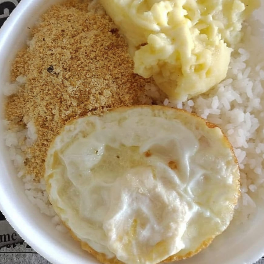 350 gr de arroz, 1 ovo frito, 90 gr de purê ou macarronada, potinho de salada