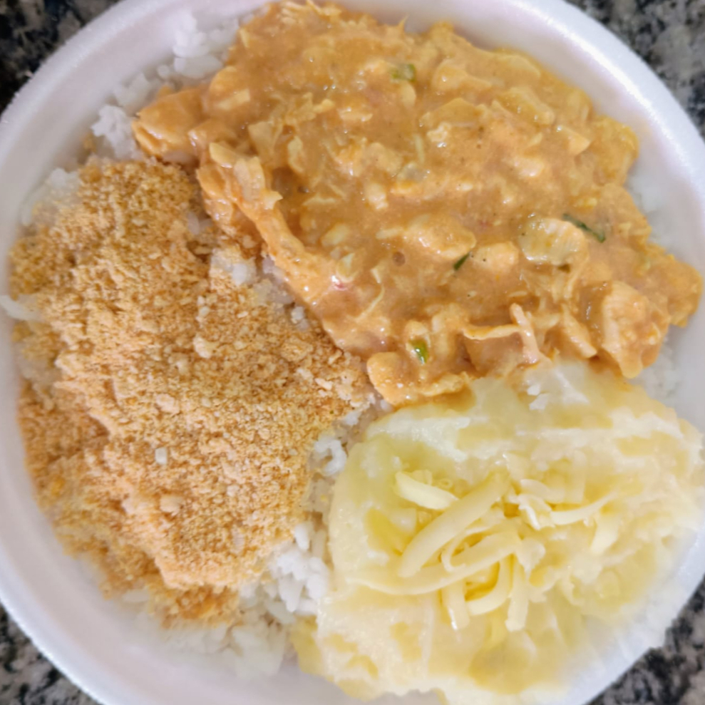 Strogonoff de Frango, É composta por: 150 gramas de feijão, 350 gramas de arroz, 90 gramas de guarnição (purê de batata com queijo ou macarronada, vc escolhe 1 opção), 1 potinho de salada, farofa e 100 gramas de Strogonofe de frango. *Não é possível substituir nenhum item.* *** NÃO VAI BATATA PALHA***
