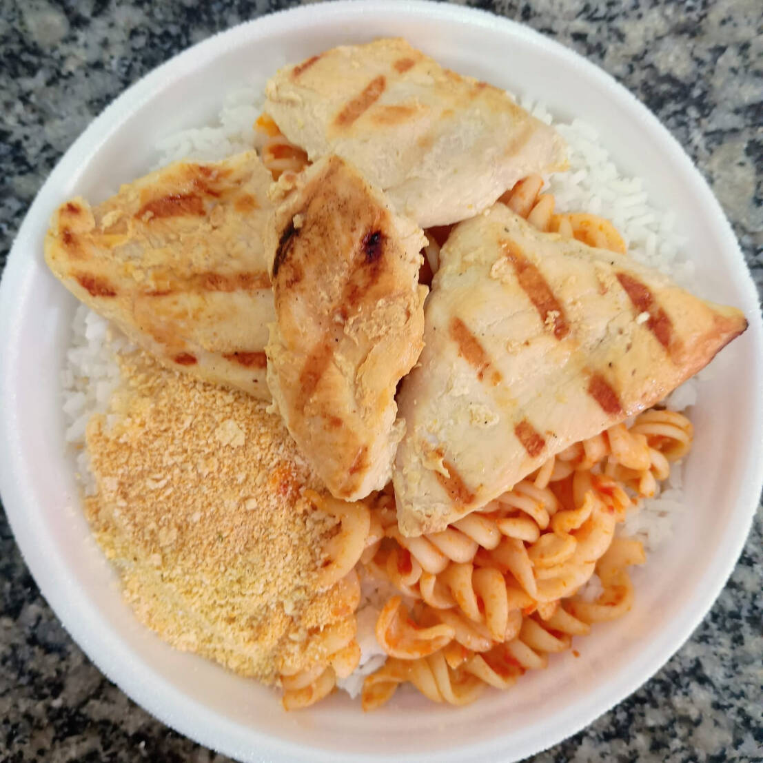 Marmita tamanho P de Filé de frango grelhado de dar água na boca, purê de batata com queijo ou macarronada, farofa temperada, vinagrete, arroz e feijão. Uma delícia! Sendo: 80 gramas de feijão, 200 gramas de arroz, 70 gramas de purê de batata com queijo ou macarronada, 1 potinho de salada, farofa e 100 gramas de filé de frango grelhado. *Não é possível substituir nenhum item.*