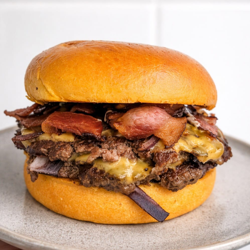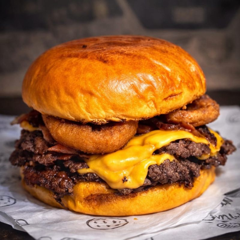 Smash Onion Duplo Bacon – Para os apaixonados por sabor e suculência! Dois smash burgers de 100g cada, cobertos com queijo prato derretido, cebola roxa chapeada e fatias crocantes de bacon. Tudo isso no pão de brioche macio, com um toque final do nosso irresistível molho especial da casa. Um lanche que eleva o nível do clássico com uma combinação perfeita de ingredientes!
