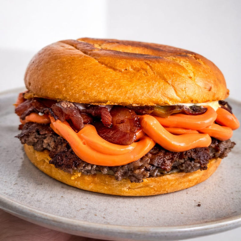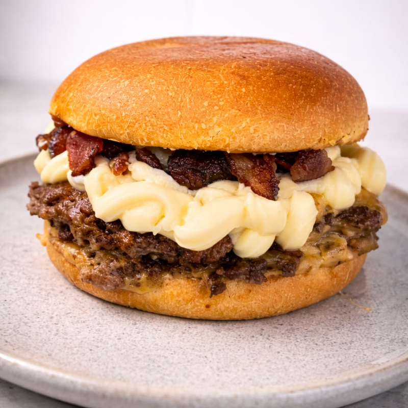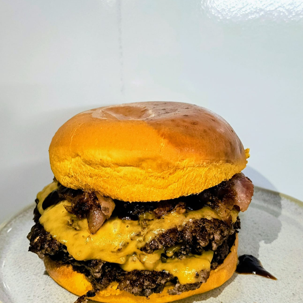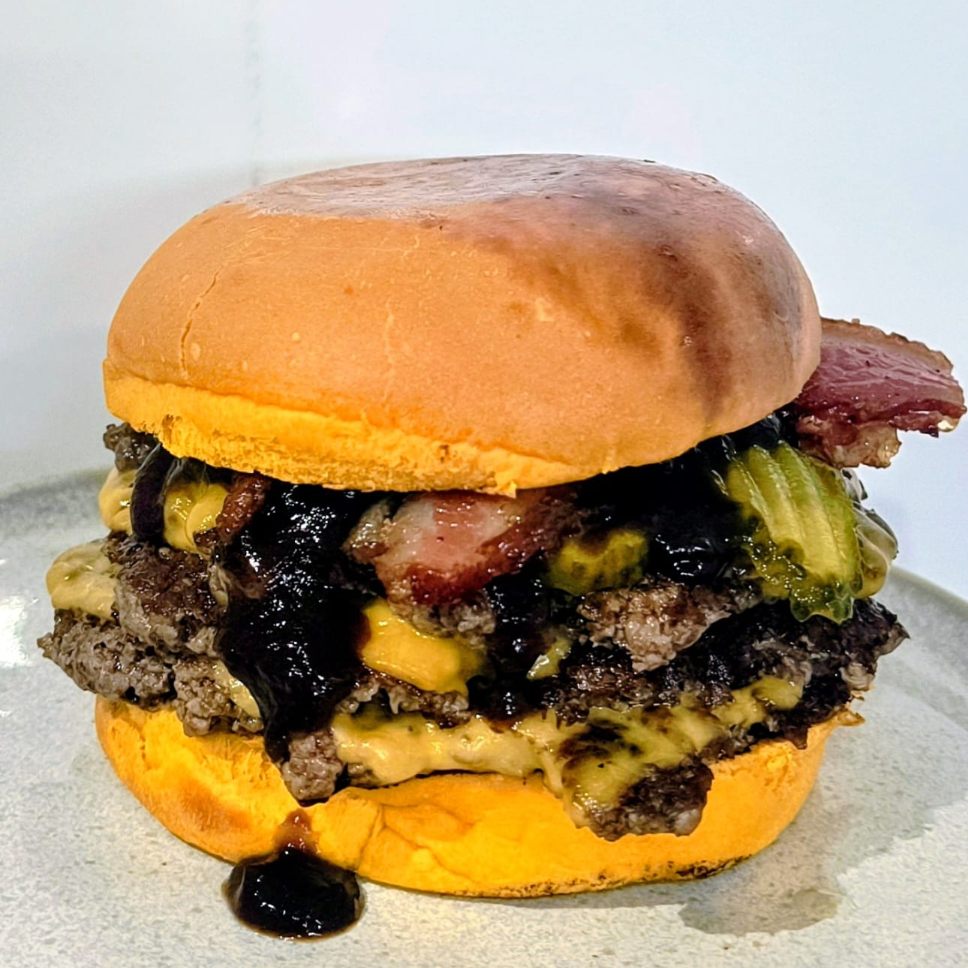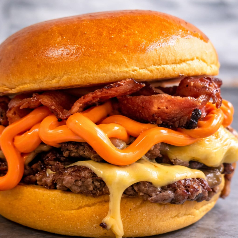 Pão de brioche , molho especial, 3 carne smash de 100g cada, queijo prato fatiado, bacon e catupiry original