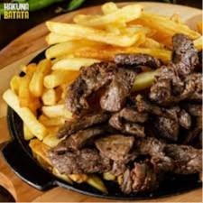 Iscas de alcatra com cebola acompanha batata frita e molho de alho.