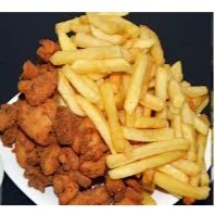 Iscas de frango empanado acompanha batata frita e molho de alho