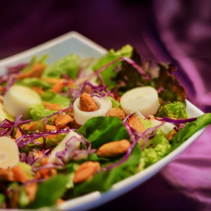 Alface, tomate, cebola, palmito, presunto, queijo, e azeitonas.