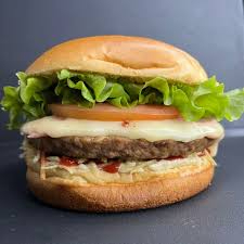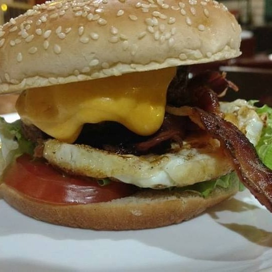 Hambúrguer artesanal de 100 gramas, maionese artesanal da casa, queijo prato, ovo, bacon, calabresa, presunto, rodelas de tomate e alface americana crocante no pão de hambúrguer.