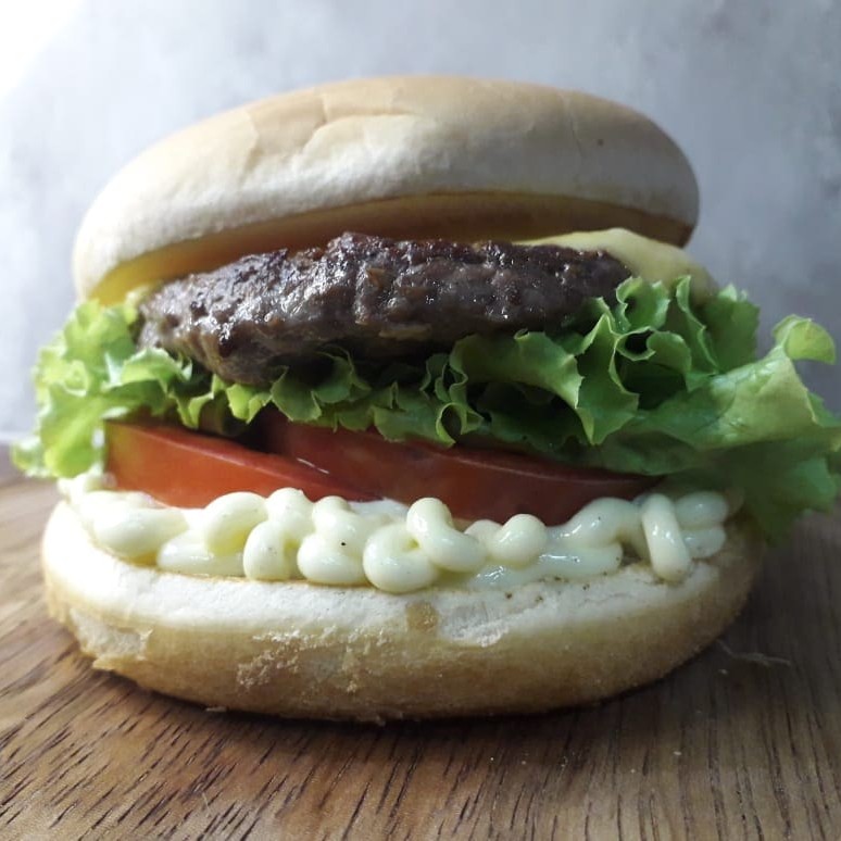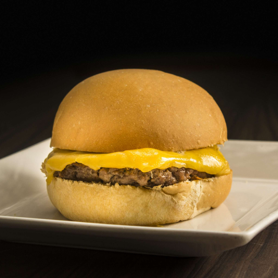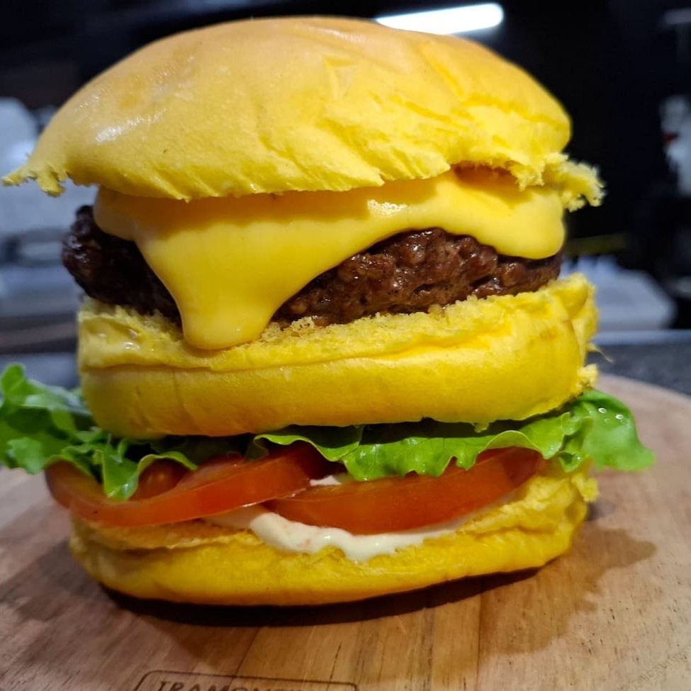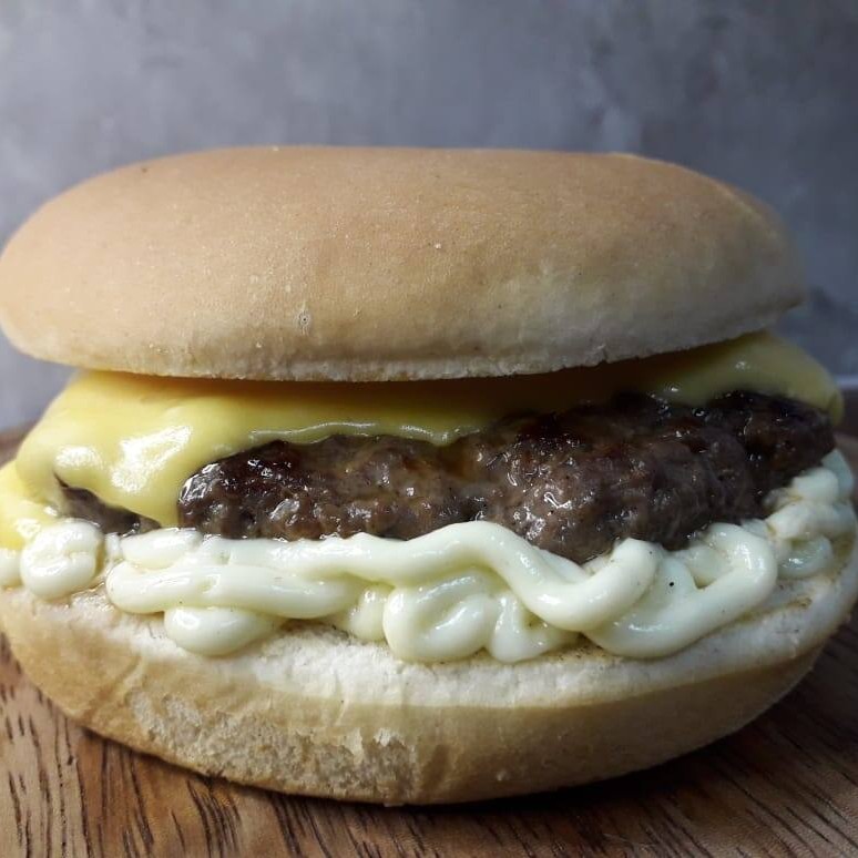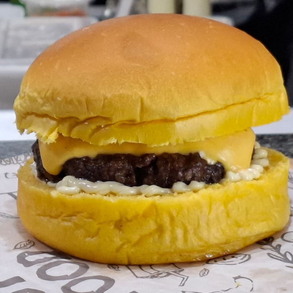 Hambúrguer artesanal de 100 gramas, maionese artesanal da casa e queijo prato.
