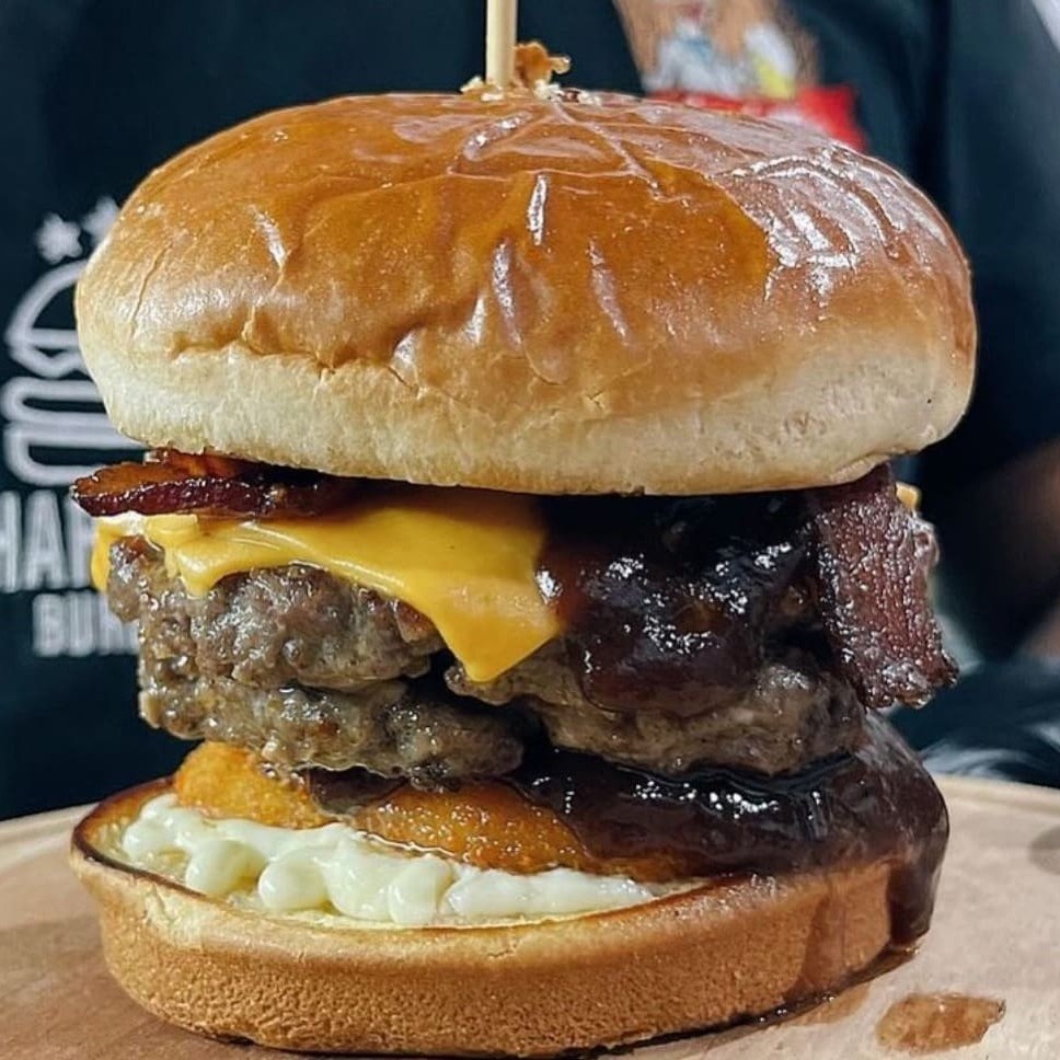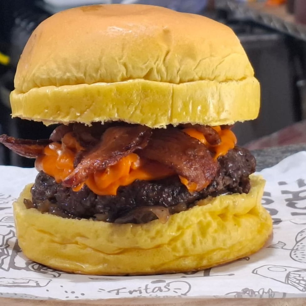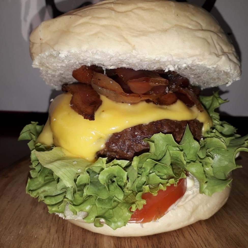 Blend de hambúrguer artesanal de 200 gramas, cebola caramelizada, cheddar cremoso, bacon crocante no pão australiano.
