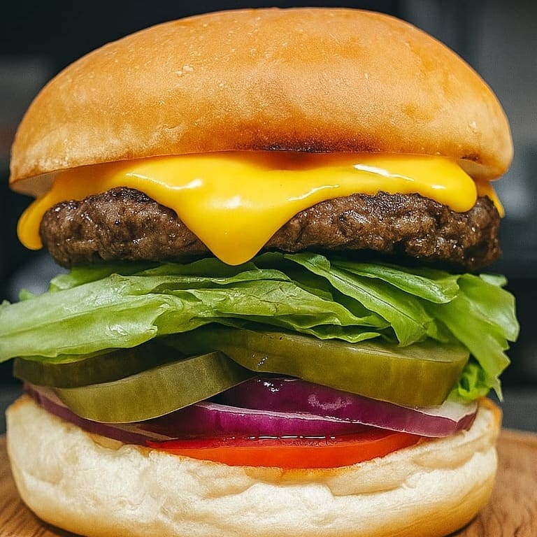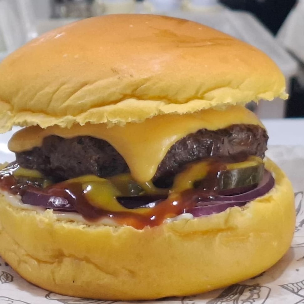 Blend de hambúrguer artesanal de 200 gramas, american cheese, picles, cebola, ketchup e mostarda no pão brioche.