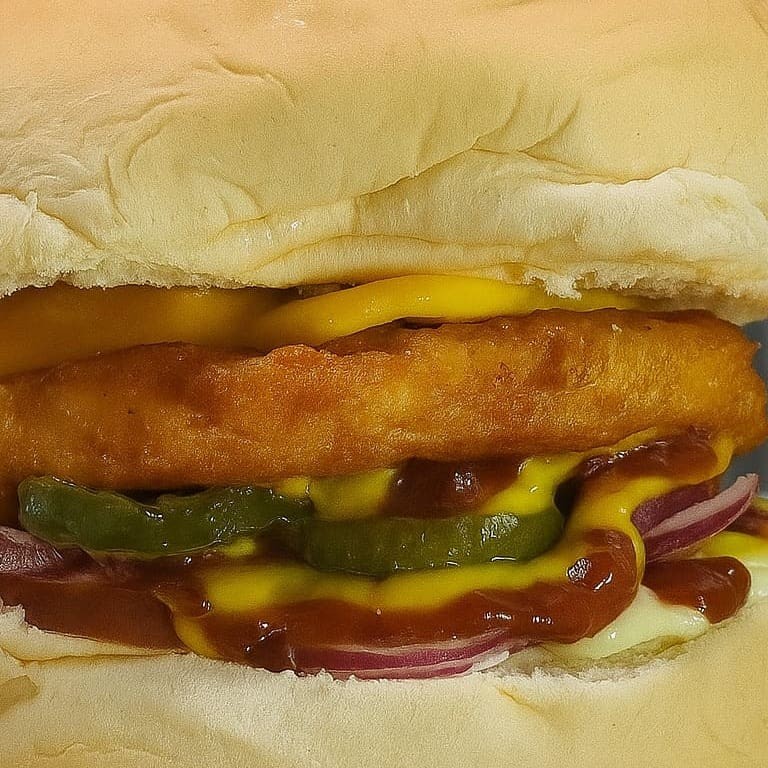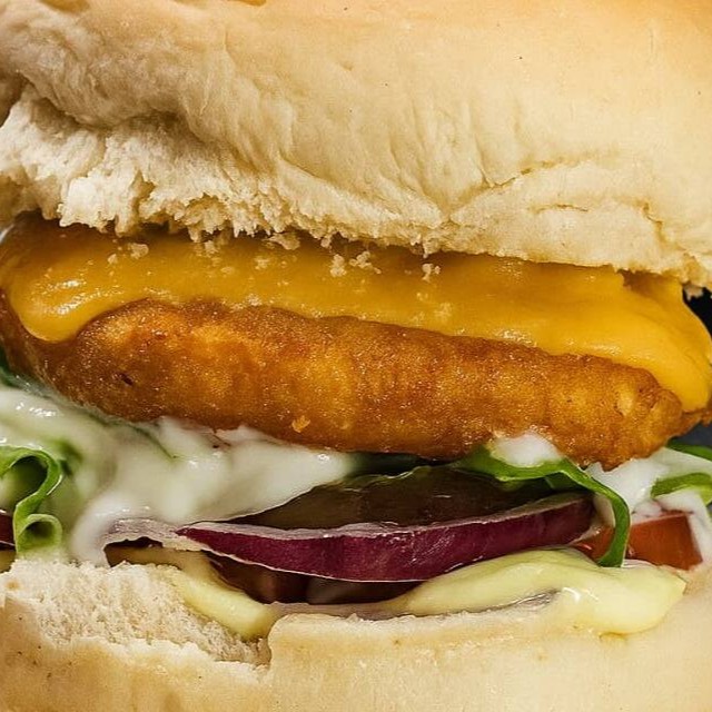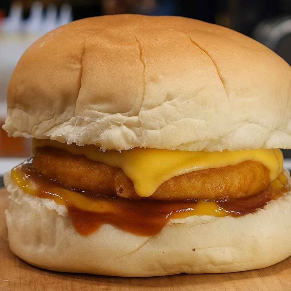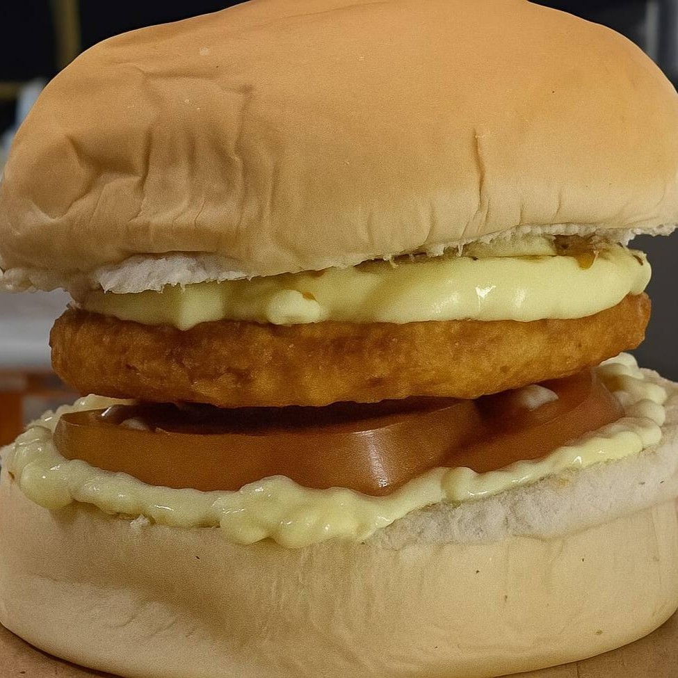 Hambúrguer de frango empanado, queijo, ketchup, mostarda e maionese.