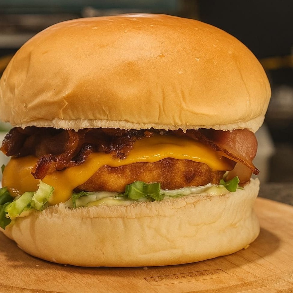 Filé de frango, maionese artesanal da casa, queijo prato, bacon, rodelas de tomate e alface americana crocante no pão de hambúrguer.