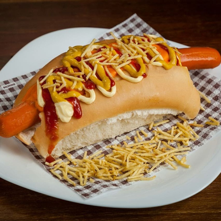 2 salsichas, maionese, ketchup, mostarda, cheddar, bacon, purê de batata, vinagrete, frango desfiado, milho verde, batata palha no pão de hot dog.