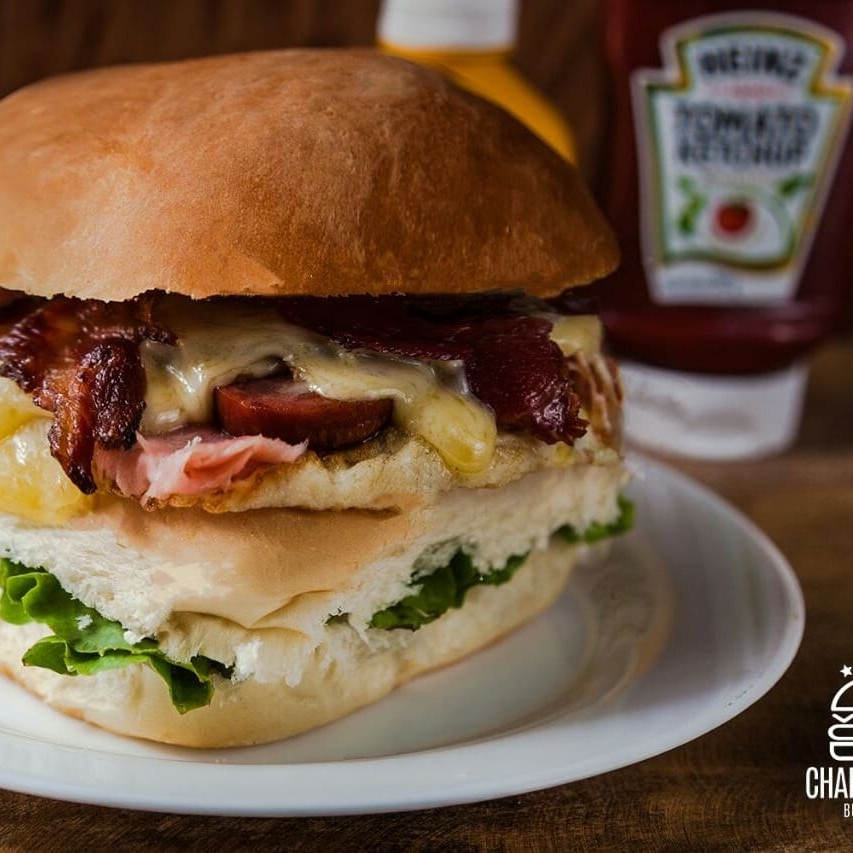 Filé de frango, maionese artesanal da casa, queijo prato, ovo, bacon, calabresa, presunto, rodelas de tomate e alface americana crocante no pão de hambúrguer.