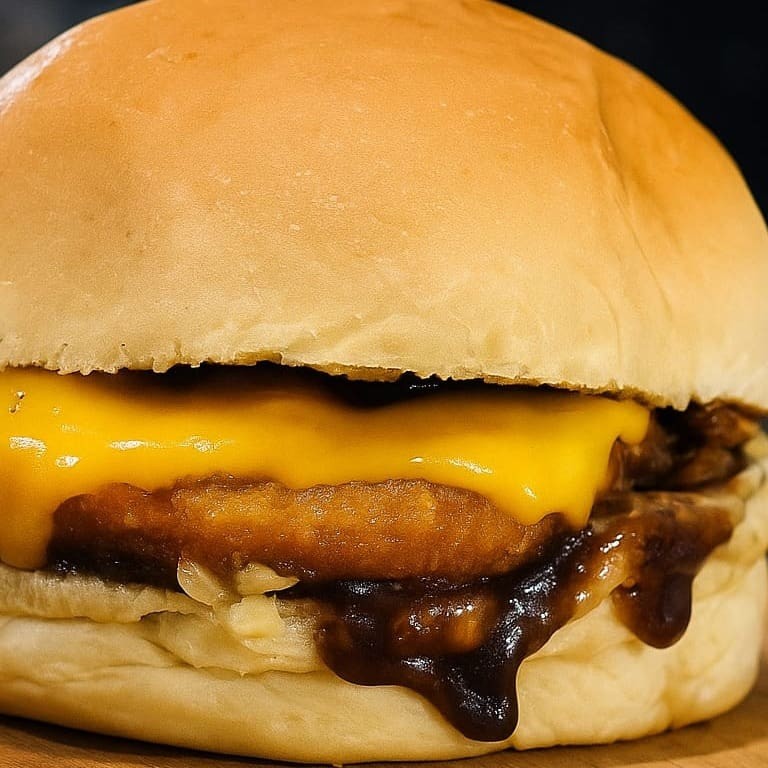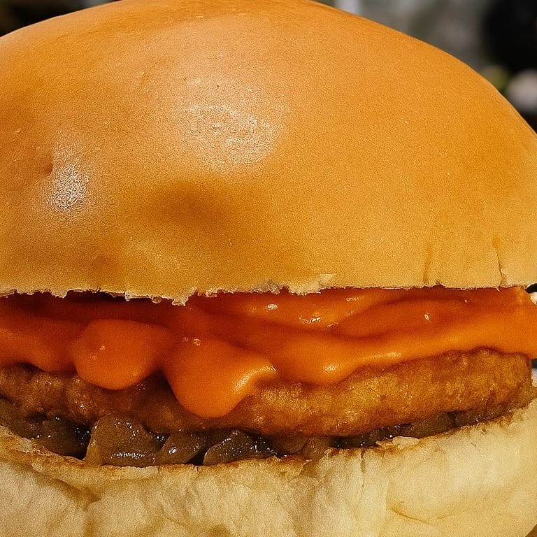 Hambúrguer de frango empanado, queijo, cebola e molho barbecue.