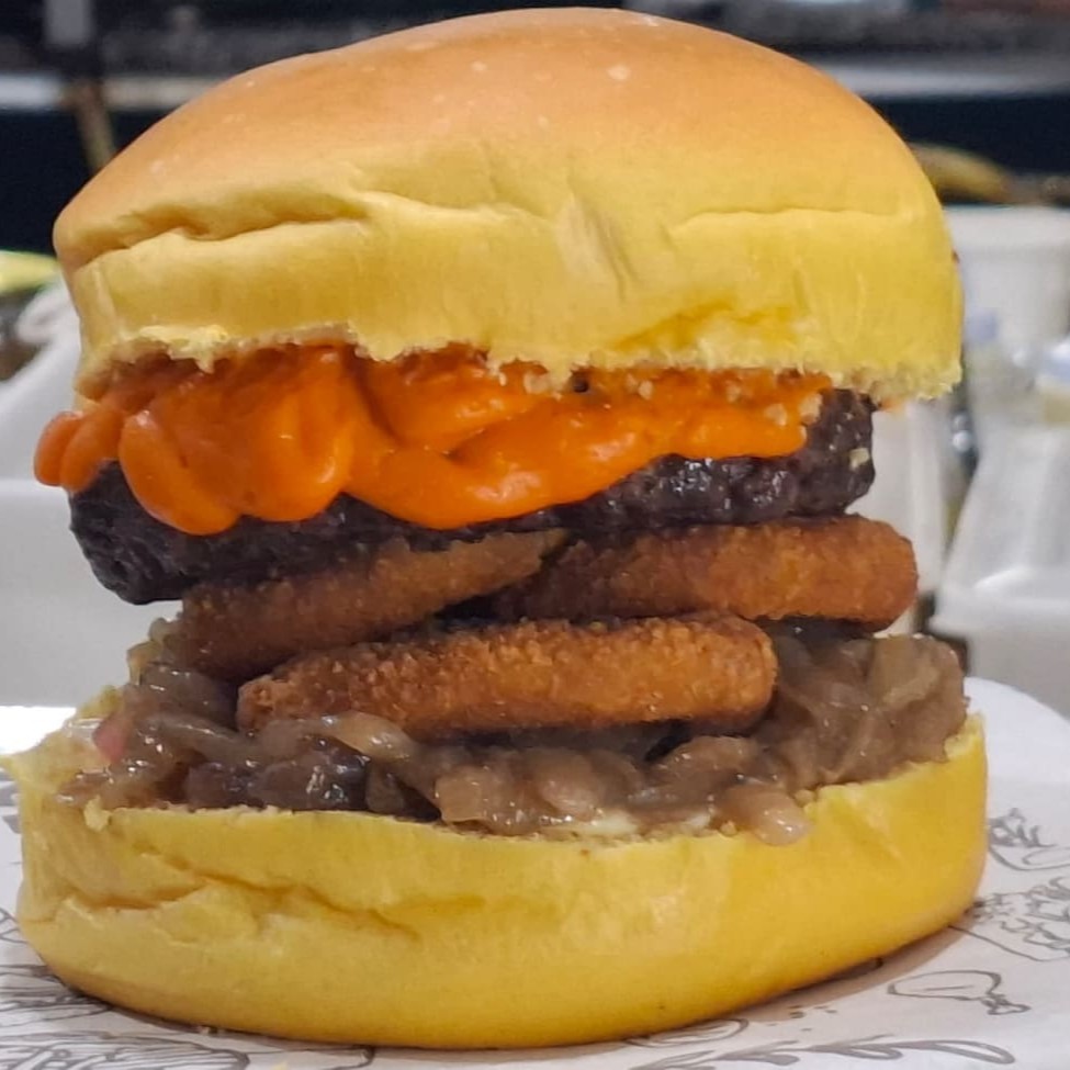 Blend de hambúrguer artesanal de 200 gramas, maionese da casa, cebola caramelizada, cebola empanada, cheddar cremoso, rodelas de tomate, no pão australiano.