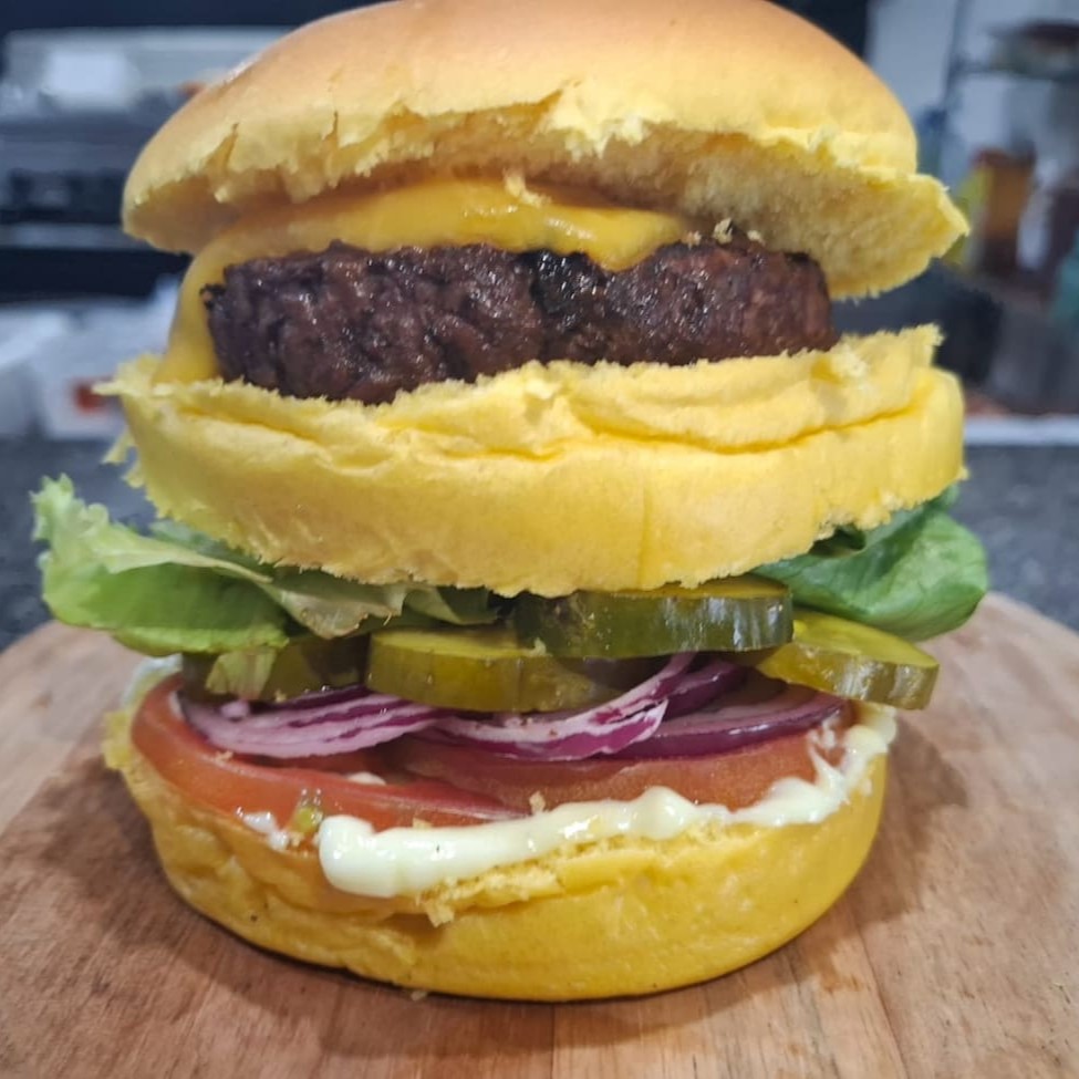 Hambúrguer artesanal de 100 gramas, maionese artesanal da casa, picles, cebola roxa, rodelas de tomate, alface americana crocante no pão de hambúrguer.