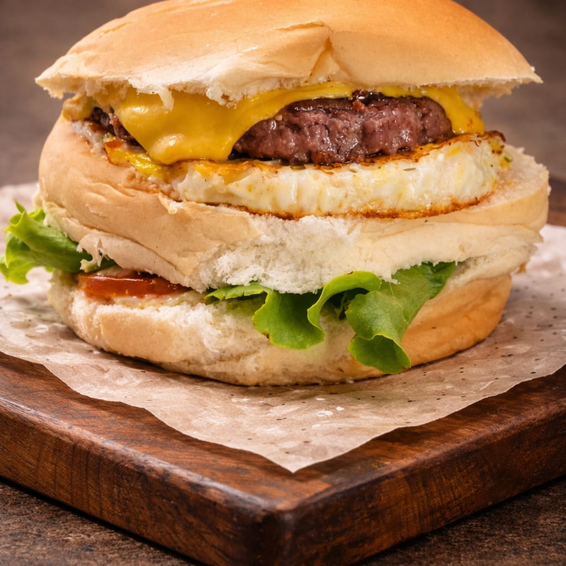 Pão, maionese da casa, tomate, alface, ovo, hambúrguer artesanal de 100 gramas, queijo, bacon.