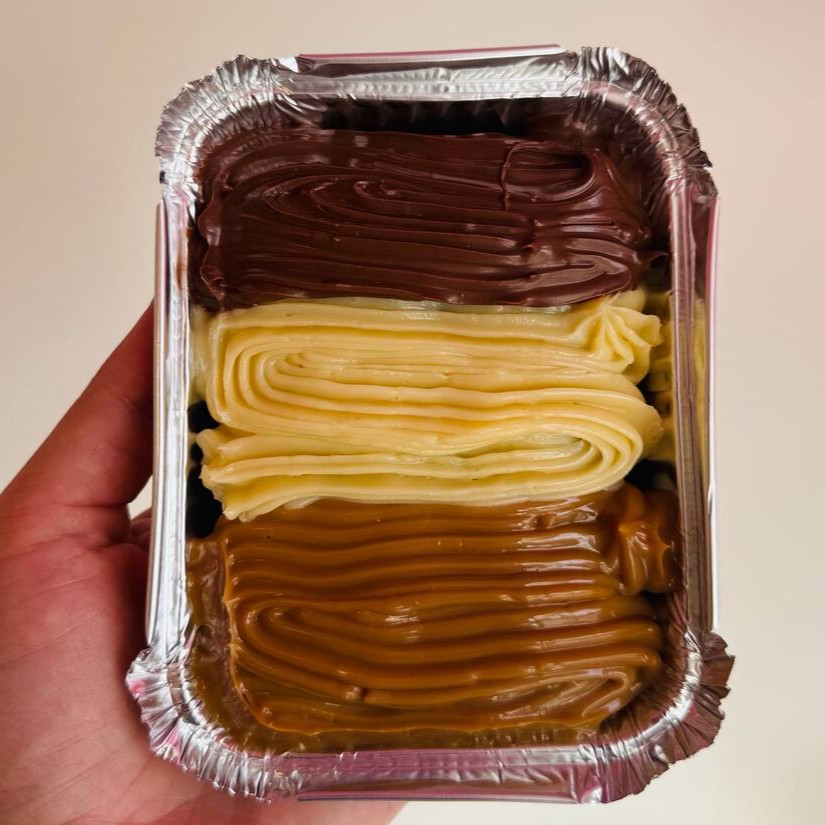 Casquinha de chocolate blend, doce de leite ( Leite Moça cozido), e brownie da Grazi.
