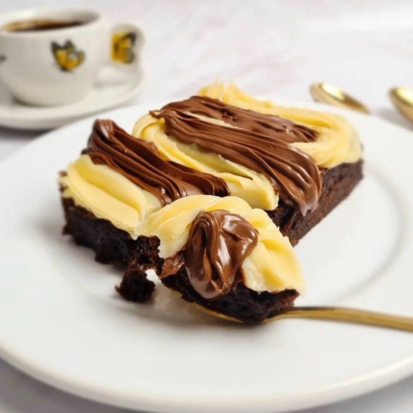 Deliciosa massa de brownie sabor chocolate com cobertura de doce de leite, Nutella e leite Ninho.