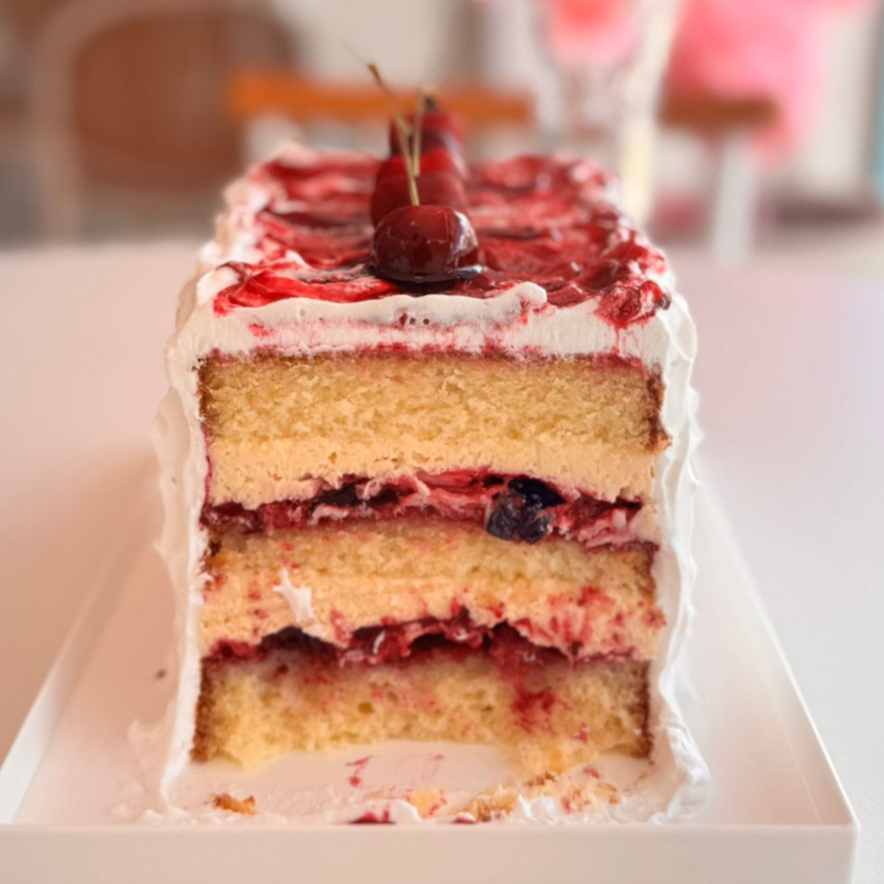 Massa branca, recheio de creme de nata com brigadeiro branco e cereja de amarena! Simplismente maravilhoso