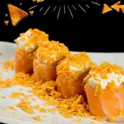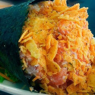 Salmão cru, arroz, alface, kani, sunomono, Doritos, nori, cream cheese, gergelim e cebolinha.