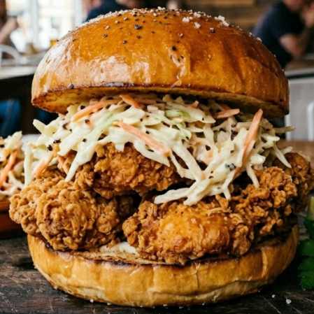 150g de sobrecoxa desossada marinada com especiarias e coleslaw caseiro no pão briche