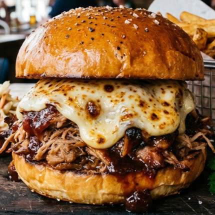200g de pulled pork e queijo provolone maçaricado no pão brioche.
