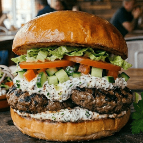 150g de hamburger de kafta, coalhada temperada, pepino, tomate e alface no pão brioche.