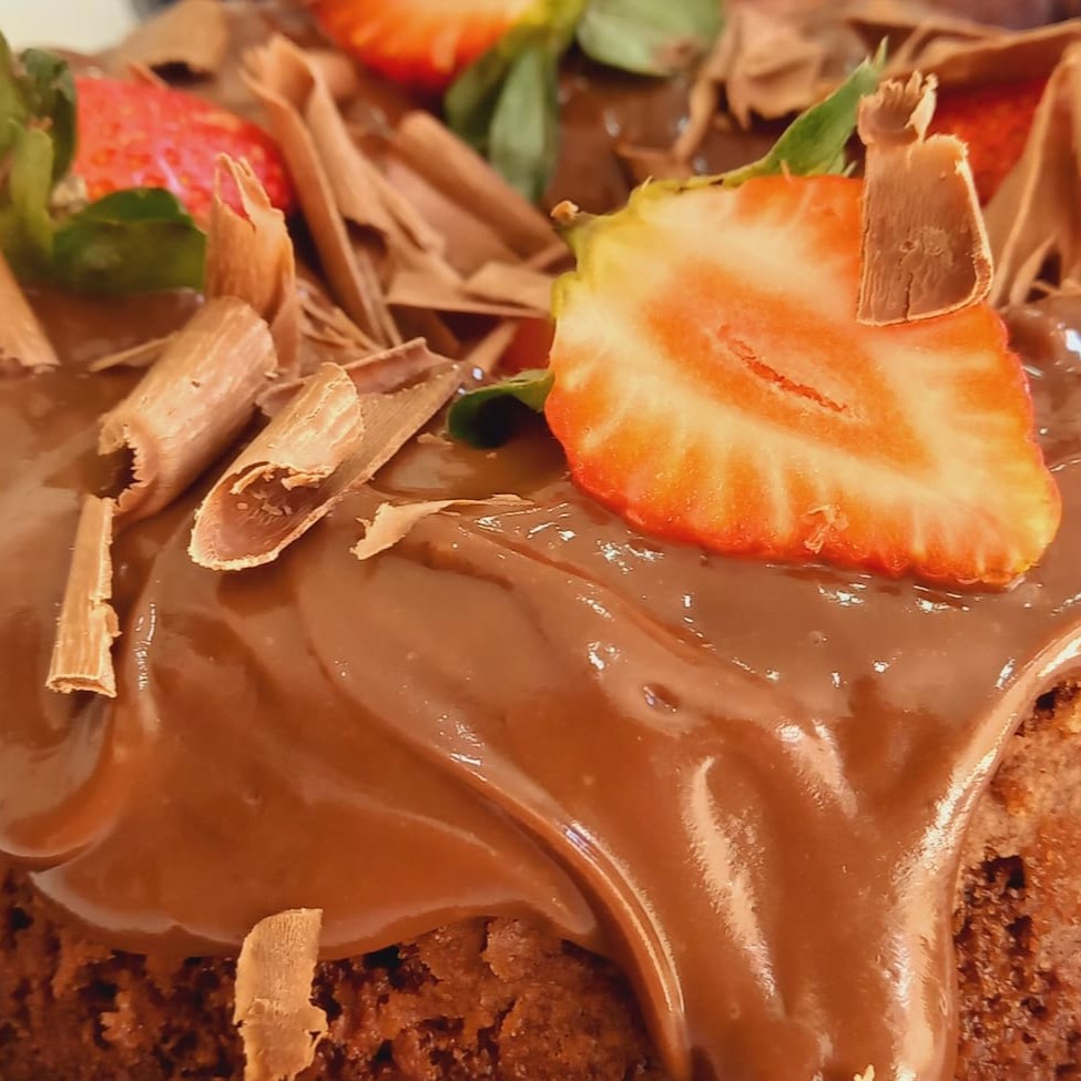 assa preparada com chocolate 50% cacau, sem conservantes e aromatizantes. Cobertura cremosa de brigadeiro com pedaços de Morangos frescos e raspas de chocolate ao leite. Atende até 7 pessoas com pedaços generosos.