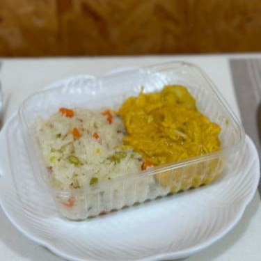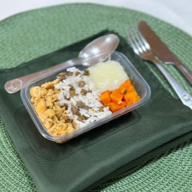 Strogonoff de frango com abóbora cabotian (150g) e arroz branco com cenoura e vagem (150g). Produto congelado!