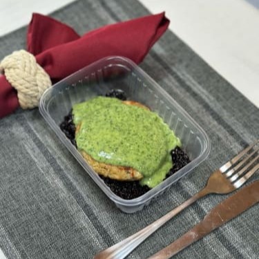 Hambúrguer de frango (120g), arroz negro (100g) e creme de espinafre (40g). Produto congelado!