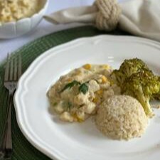 Frango com creme de milho (130g), arroz integral (100g) e brócolis (40g). Produto congelado!