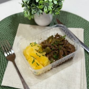 Carne em tiras com brócolis ao molho shoyo (140g) e mandioca (120g). Produto congelado!