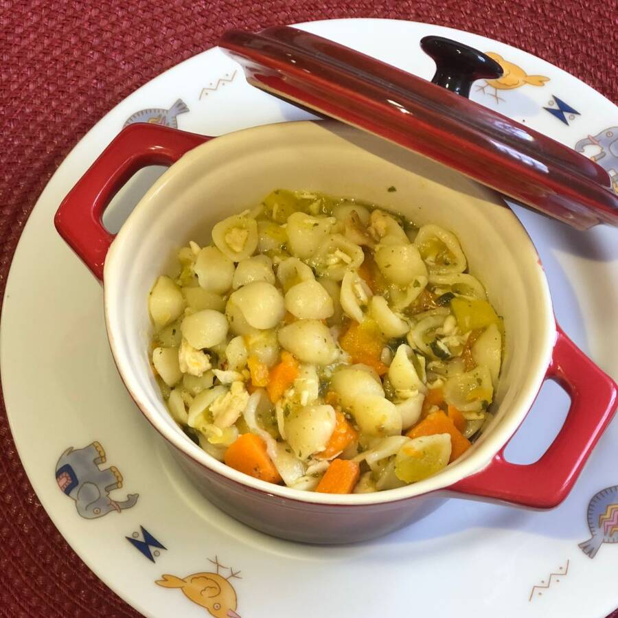 Frango, mandioquinha, cenoura, espinafre e macarrão em pedacinhos (150g). Produto congelado!