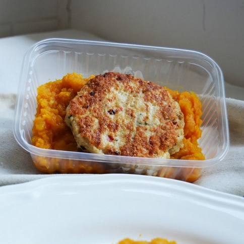 Hambúrguer de frango (120g) com abóbora cabotiá (200g). Produto congelado!