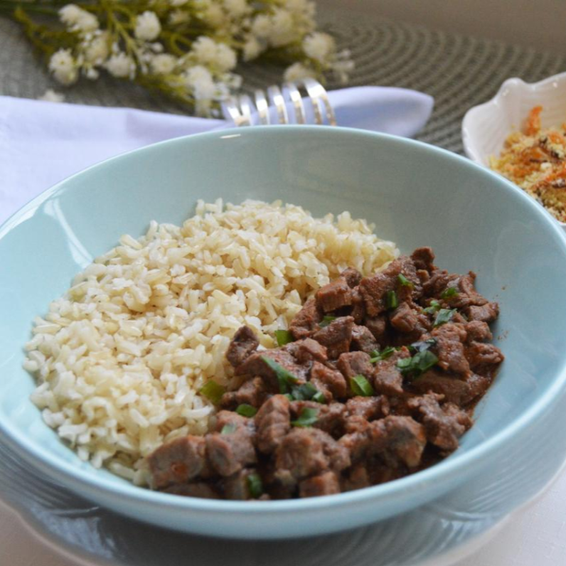 Picadinho de coxão mole (150g) com arroz integral (120g) e farofa (30g). Produto congelado!