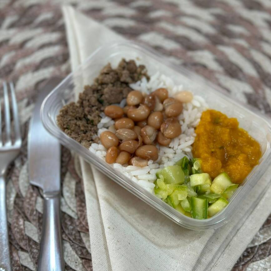 Carne moída, arroz branco, feijão, abóbora cabotiá e abobrinha (200g). Produto congelado!