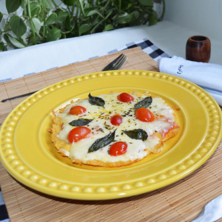 Pizza com massa de farinha de frango e recheio de mussarela, tomate cereja e manjericão (160g). Produto congelado