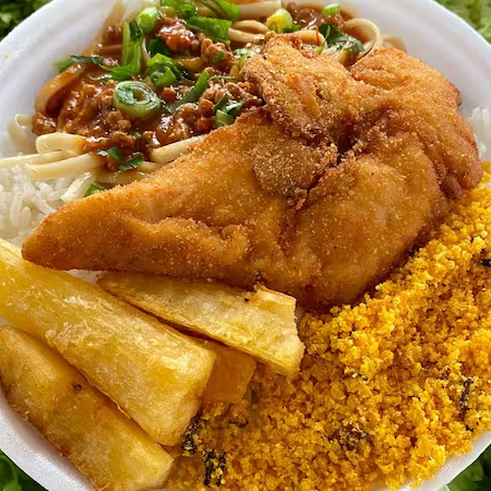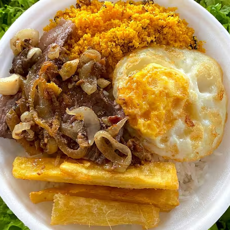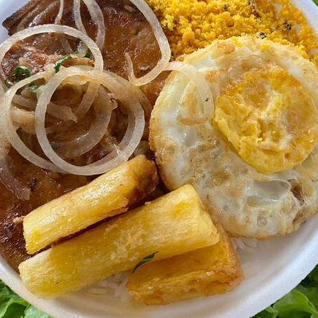 ARROZ E FEIJÃO. File de frango empanado. Lombo na chapa. Torresmo e macarrão a moda da casa.