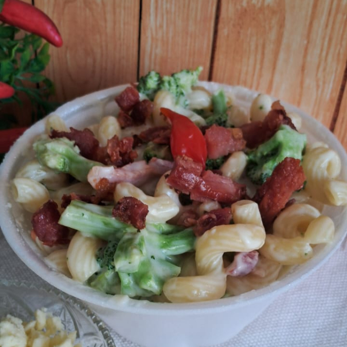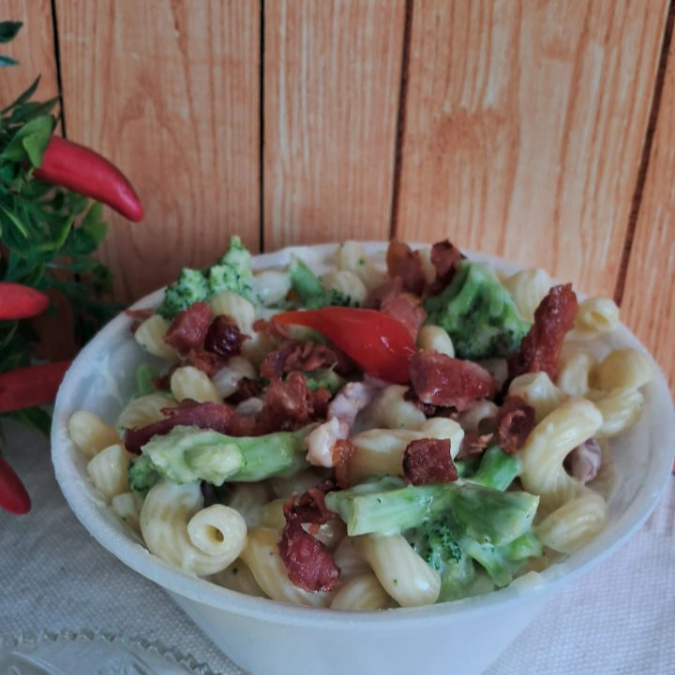 delicioso macarrão com molho branco, brócolis, mussarela e bacon