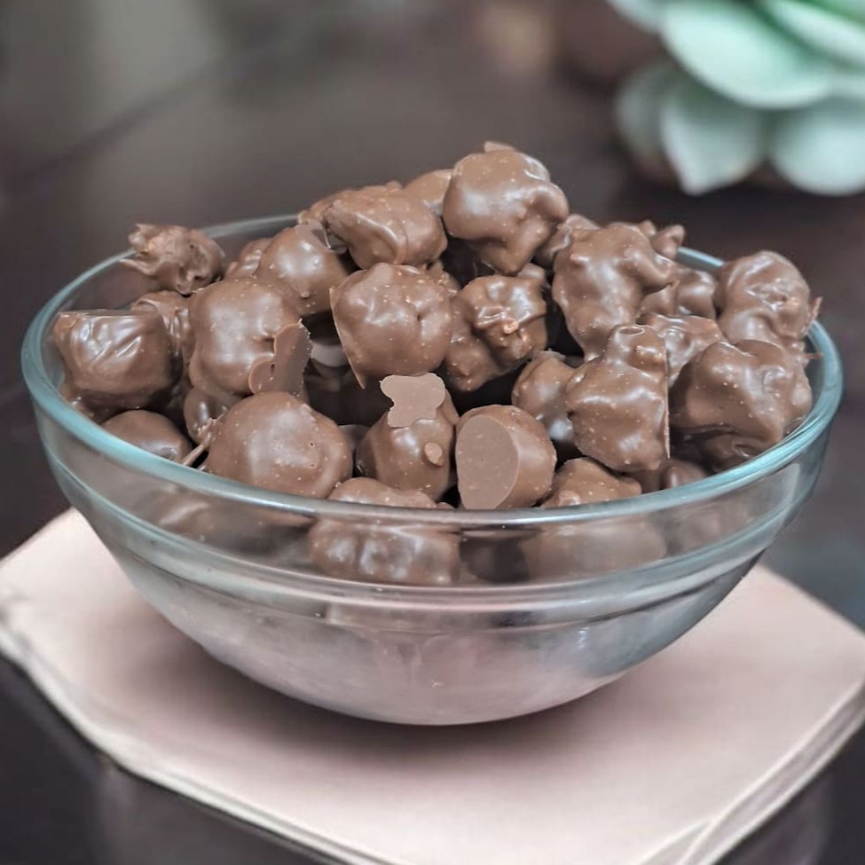 Pipoca caramelizada, com uma camada de Chocolate e finalizada no chocolate Alpino.