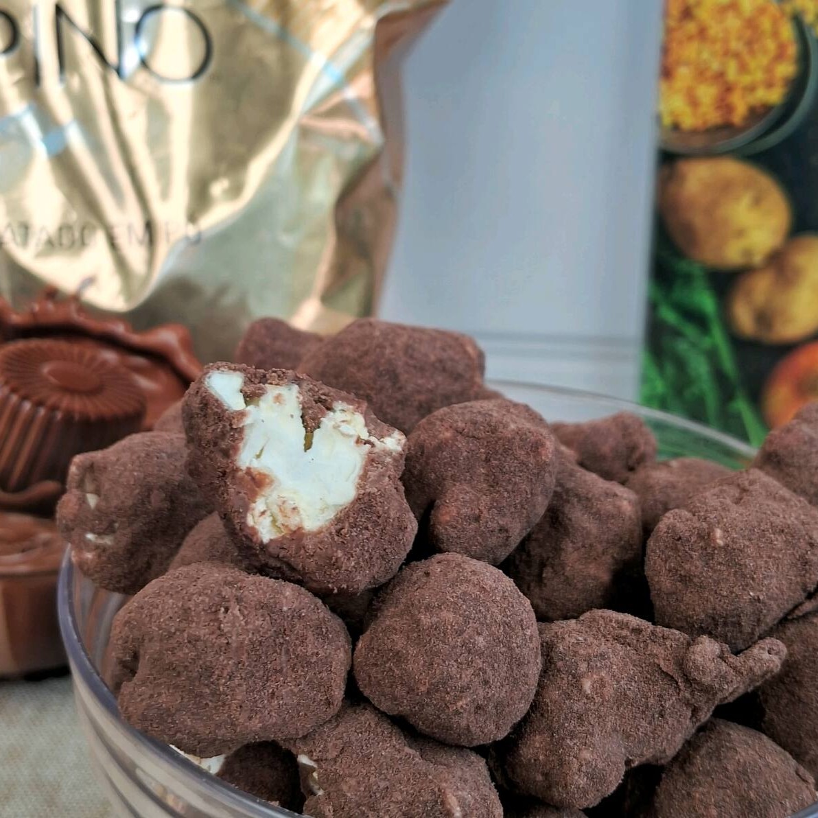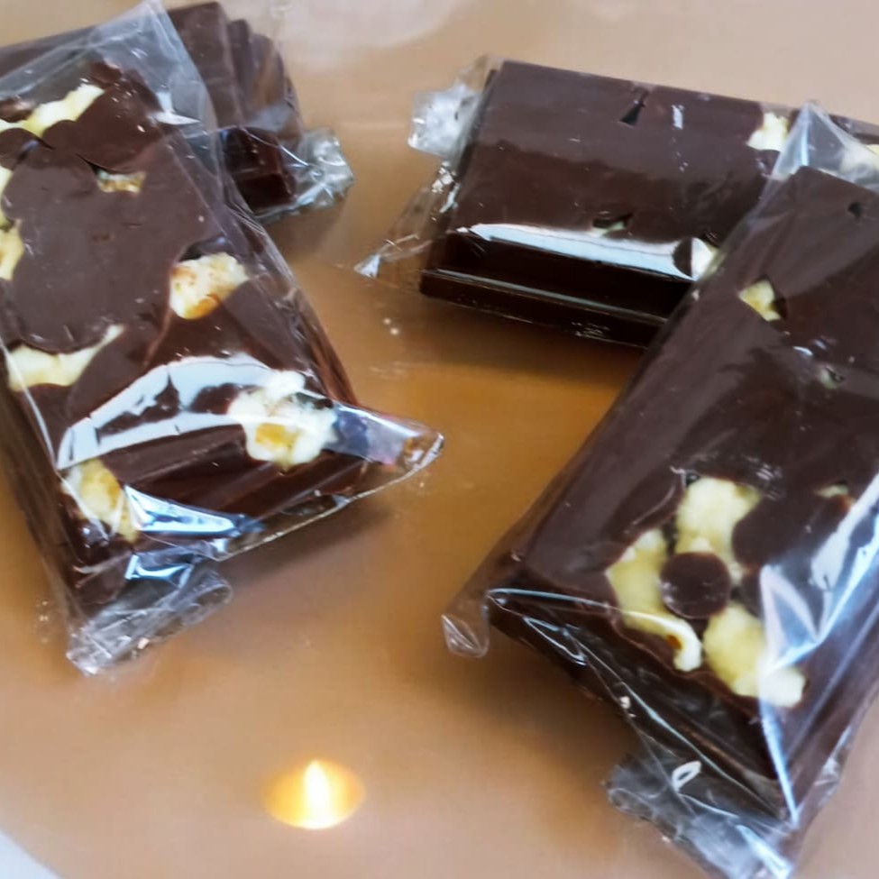 Pipoca Gourmet banhada no chocolate ao leite e finalizada no leite Ninho.