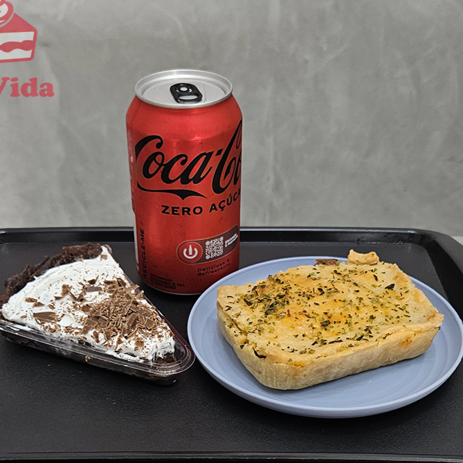 uma torta salgada na marmitinha (apx 190g) + uma fatia doce (apx 120g) e uma bebida geladinha