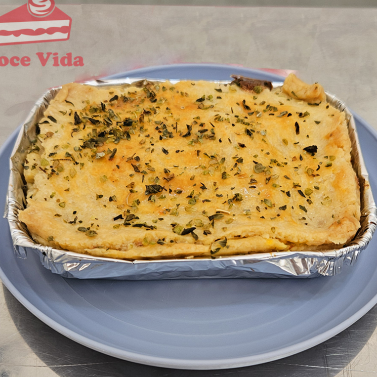 massa caseira, recheio de palmito picado com azeitonas, cheiro verde, tomate, cebola e requeijão