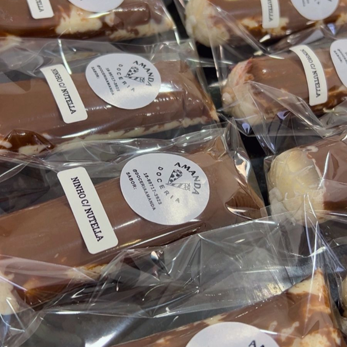 Base de ninho com Oreo, recheio de Nutella pura. Banhado no chocolate branco com bolacha oreo