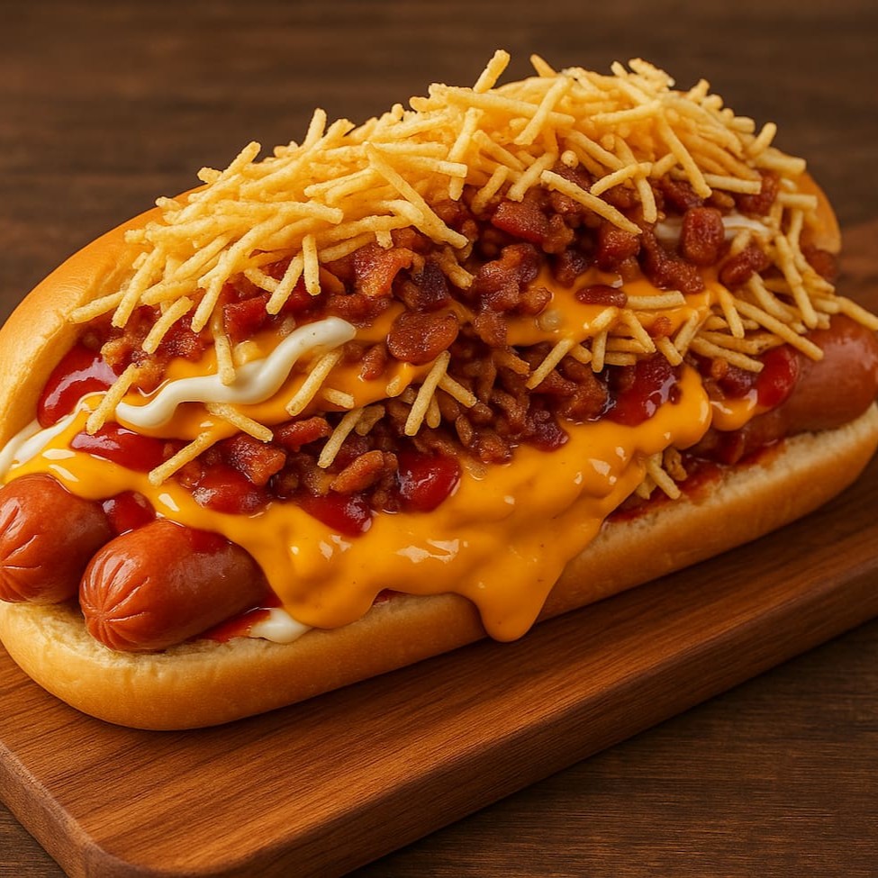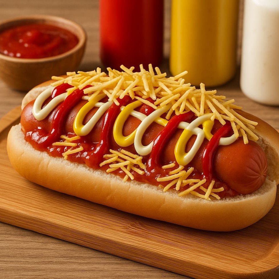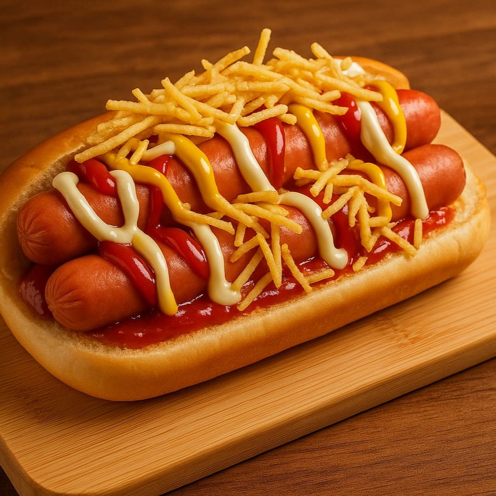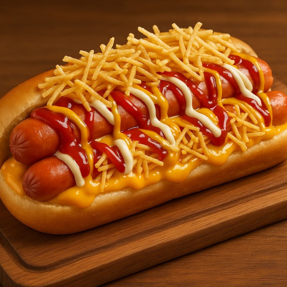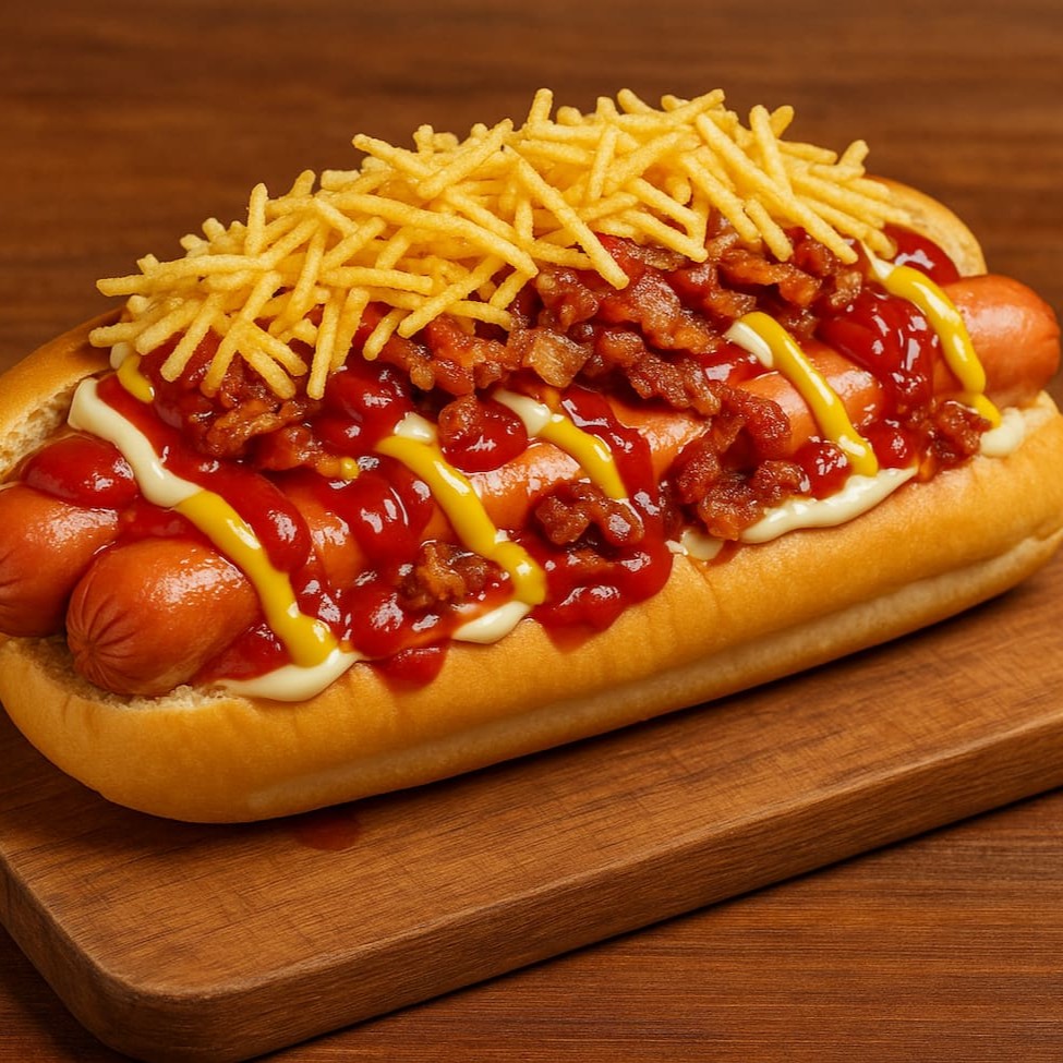 O clássico ficou ainda melhor. Pão macio recheado com 2 salsichas suculentas, cobertas com ketchup, mostarda, maionese e um molho de tomate irresistível. Finalizado com batata palha crocante e pedaços generosos de bacon. Uma explosão de sabor que vai te surpreender. E bora adicionar aquele puzerinho que a gente ama?! Entao bora!