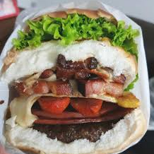 Hambúrguer, queijo, presunto, milho, bacon, alface e tomate.