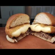 Hambúrguer, queijo empanado e molho defumado.