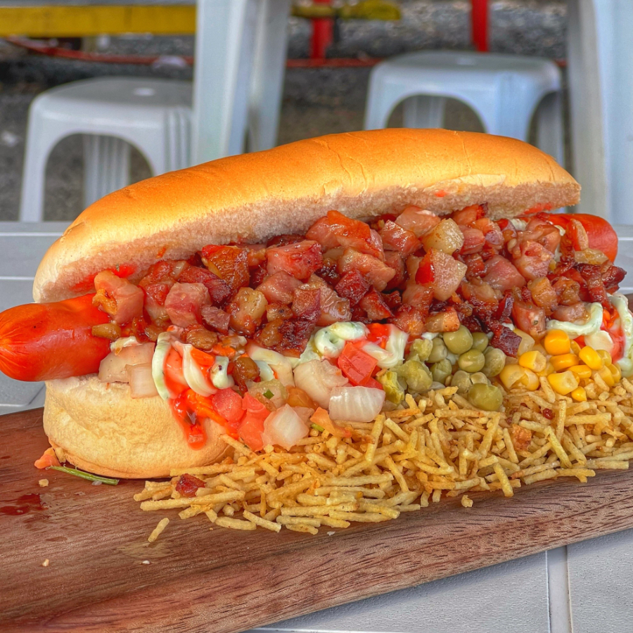 Salsicha, calabresa, bacon, catupiry, milho, alface, tomate e batata palha.
